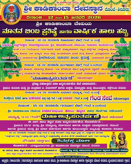 ಬೈಂದೂರು: ಶ್ರೀ ಕಾಡಿಕಾಂಬಾ ದೇವಸ್ಥಾನ ದೊಂಬೆ ಶಿರೂರು ಇದರ ಶ್ರೀ ಕಾಡಿಕಾಂಬಾ ದೇವಿಯ ನೂತನ ಬಿಂಬ ಪ್ರತಿಷ್ಠೆ ಹಾಗೂ ವಾರ್ಷಿಕ ಹಾಲು ಹಬ್ಬ ಜ.12 ರಿಂದ ಮತ್ತು 15ರ ವರೆಗೆ ನಡೆಯಲಿದೆ.