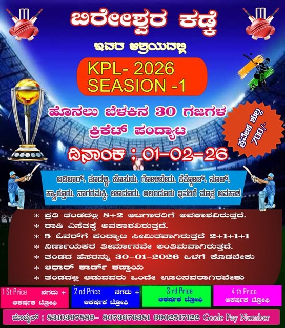 ಶಿರೂರು: ಬೀರೇಶ್ವರ ಕಡ್ಕೆ ಇವರ ಆಶ್ರಯದಲ್ಲಿ ಹೊನಲು ಬೆಳಕಿನ 30 ಗಜಗಳ ಕ್ರಿಕೆಟ್ ಪಂದ್ಯಾಟ ಕೆ.ಪಿ.ಎಲ್ -2026 ಸೀಸನ್ – 1 ಕ್ರಿಕೆಟ್ ಪಂದ್ಯಾಟ ಫೆ.01 ರಂದು ಕಡ್ಕೆ ಮೈದಾನದಲ್ಲಿ ನಡೆಯಲಿದೆ.ಅಡಿಬೇರು,ತೂದಳ್ಳಿ,ಹೊಸೂರು,ಗೋಳಿಬೇರು,ಕೆಕ್ಕೋಡ್,ನೂಜ್,ಕ್ಯಾರ್ತೂರು,ನಾಗರಮಕ್ಕಿ,ಊದೂರು,ಆಲಂದೂರು ತಂಡಗಳು ಭಾಗವಹಿಸಬಹುವುದಾಗಿದೆ.ವಿಜೇತ ತಂಡಗಳಿಗೆ ನಗದು ಹಾಗೂ ಶಾಶ್ವತ ಫಲಕ ದೊರೆಯಲಿದೆ ಎಂದು ಸಂಘಟಕ ಮಹಾದೇವ ಗೊಂಡ ಕಡ್ಕೆ ಪ್ರಕಟಣೆಯಲ್ಲಿ ತಿಳಿಸಿದ್ದಾರೆ.
