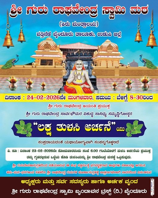 ಬೈಂದೂರು: ಶ್ರೀ ಗುರು ರಾಘವೇಂದ್ರ ಸ್ವಾಮಿ ಮಠ (ಕಿರು ಮಂತ್ರಾಲಯ) ವತ್ತಿನೆಣೆ ಬೈಂದೂರು ಇದರ ಶ್ರೀ ಗುರು ರಾಘವೇಂದ್ರ ಸ್ವಾಮಿ ಜಯಂತಿ ಪ್ರಯುಕ್ತ ಶ್ರೀ ಗುರು ರಾಘವೇಂದ್ರ ಸಾರ್ವಭೌಮರ ವಿಶುದ್ದ ಸಾನಿದ್ಯ ಸಮೃದ್ದಿಗೋಸ್ಕರ ಲಕ್ಷ ತುಳಸಿ ಅರ್ಚನೆ ಫೆ.24 ರಂದು ಪೂರ್ವಾಹ್ನ 8:30ಕ್ಕೆ ನಡೆಯಲಿದೆ.ಬೆಳಿಗ್ಗೆ ರಾಯರ ಸನ್ನಧಿಯಲ್ಲಿ ವಿವಿಧ ಪೂಜಾ ವಿಧಿ ವಿಧಾನಗಳು ನಡೆಯಲಿದ್ದು ಸಂಜೆ ಭಜನಾ ಕಾರ್ಯಕ್ರಮ ನಡೆಯಲಿದೆ ಎಂದು ಪ್ರಕಟಣೆಯಲ್ಲಿ ತಿಳಿಸಲಾಗಿದೆ.