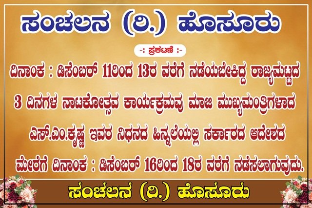 ಬೈಂದೂರು: ಸಂಚಲನ(ರಿ.) ಹೊಸೂರು ಹಾಗೂ ಕನ್ನಡ ಮತ್ತು ಸಂಸ್ಕ್ರತಿ ಇಲಾಖೆ ಇದರ ವತಿಯಿಂದ ಡಿ.11 ,12 ಹಾಗೂ 13 ರಂದು ಕೆ.ವಿ ಸುಬ್ಬಣ್ಣ ಬಯಲು ವನರಂಗ ಮಂದಿರ ಹೊಸೂರಿನಲ್ಲಿ ನಡೆಯಬೇಕಿದ್ದ ವನಸಿರಿಯಲ್ಲೊಂದು ರಂಗ ಸುಗ್ಗಿ ಮೂರು ದಿನಗಳ ರಾಜ್ಯ ಮಟ್ಟದ ನಾಟಕೋತ್ಸವ ಕಾರ್ಯಕ್ರವವನ್ನು ತಾತ್ಕಾಲಿಕವಾಗಿ ಮುಂದೂಡಲಾಗಿದೆ.ಮಾಜಿ ಮುಖ್ಯಮಂತ್ರಿ ಎಸ್.ಎಂ.ಕೃಷ್ಣ ರವರ ನಿಧನದ ಹಿನ್ನೆಲ್ಲೆಯಲ್ಲಿ ಸರ್ಕಾರದ ಆದೇಶದ ಮೇರೆಗೆ ಶೋಕಾಚರಣೆ ಇರುವ ಕಾರಣ ನಾಟಕೋತ್ಸವ ಮುಂದೂಡಲಾಗಿದ್ದು ಡಿ.16 ರಿಂದ 18 ರವರೆಗೆ ಮೂರು ದಿನಗಳ ರಾಜ್ಯ ಮಟ್ಟದ ನಾಟಕೋತ್ಸವ ಕಾರ್ಯಕ್ರಮ ನಡೆಯಲಿದೆ ಎಂದು ಸಂಚಲನ ಸಂಸ್ಥೆಯ ಪ್ರಕಟಣೆಯಲ್ಲಿ ತಿಳಿಸಲಾಗಿದೆ.