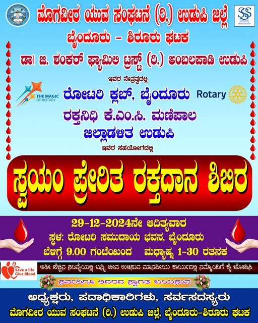 ಬೈಂದೂರು: ಮೊಗವೀರ ಯುವ ಸಂಘಟನೆ(ರಿ.)ಉಡುಪಿ ಜಿಲ್ಲೆ ಬೈಂದೂರು -ಶಿರೂರು ಘಟಕ,ಡಾ.ಜಿ.ಶಂಕರ್ ಫ್ಯಾಮಿಲಿ ಟ್ರಸ್ಟ್ ಅಂಬಲಪಾಡಿ ಉಡುಪಿ,ರೋಟರಿ ಕ್ಲಬ್ ಬೈಂದೂರು,ರಕ್ತನಿಧಿ ಕೆ.ಎಂ.ಸಿ ಮಣಿಪಾಲ ಹಾಗೂ ಜಿಲ್ಲಾಡಳಿತ ಉಡುಪಿ ಇವರ ಸಹಯೋಗದಲ್ಲಿ ಸ್ವಯಂ ಪ್ರೇರಿತ ರಕ್ತದಾನ ಶಿಬಿರ ಡಿ.29 ರಂದು ಪೂರ್ವಾಹ್ನ 9 ಗಂಟೆಗೆ ರೋಟರಿ ಸಮುದಾಯ ಭವನ ಬೈಂದೂರಿನಲ್ಲಿ ನಡೆಯಲಿದೆ ಎಂದು ಪ್ರಕಟಣೆಯಲ್ಲಿ ತಿಳಿಸಲಾಗಿದೆ.