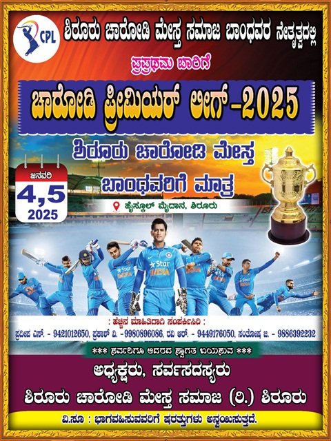 ಶಿರೂರು: ಶಿರೂರು ಚಾರೋಡಿ ಮೇಸ್ತ ಸಮಾಜ ಬಾಂಧವರ ನೇತ್ರತ್ವದಲ್ಲಿ ಪ್ರಪ್ರಥಮ ಬಾರಿಗೆ ಚಾರೋಡಿ ಪ್ರಿಮಿಯರ್ -2025 ಕ್ರಿಕೆಟ್ ಪಂದ್ಯಾಟ ಜನವರಿ 4 ಹಾಗೂ 5 ರಂದು ಸರಕಾರಿ ಪದವಿ ಪೂರ್ವ ಕಾಲೇಜು ಮೈದಾನ ಶಿರೂರಿನಲ್ಲಿ ನಡೆಯಲಿದೆ,ಕ್ರಿಕೆಟ್ ಪಂದ್ಯಾಟವು ಚಾರೋಡಿ ಮೇಸ್ತ ಸಮಾಜ ಬಾಂಧವರಿಗೆ ಮಾತ್ರ ಆಯೋಜಿಸಲಾಗಿದೆ ಎಂದು ಪ್ರಕಟಣೆಯಲ್ಲಿ ತಿಳಿಸಲಾಗಿದೆ.