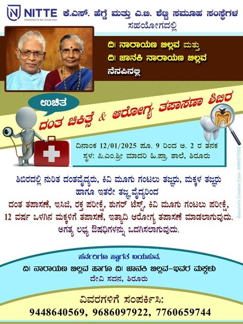 ಶಿರೂರು: ನಿಟ್ಟೆ ಕೆ.ಎಸ್.ಹೆಗ್ಡೆ ಮತ್ತು ಎ.ಬಿ ಶೆಟ್ಟಿ ಸಮೂಹ ಸಂಸ್ಥೆಗಳ ಸಹಯೋಗದಲ್ಲಿ ದಿ.ನಾರಾಯಣ ಬಿಲ್ಲವ ಹಾಗೂ ದಿ.ಜಾನಕಿ ಬಿಲ್ಲವ ಇವರ ಸವಿನೆನಪಿಗಾಗಿ ದಂತ ಚಿಕಿತ್ಸೆ ಮತ್ತು ಆರೋಗ್ಯ ತಪಾಸಣಾ ಶಿಬಿರ ಜ.12 ರಂದು ಪೂರ್ವಾಹ್ನ 9 ಗಂಟೆಗೆ ಪಿ.ಎಂ.ಶ್ರೀ ಸರಕಾರಿ ಮಾದರಿ ಹಿರಿಯ ಪ್ರಾಥಮಿಕ ಶಾಲೆ ಶಿರೂರಿನಲ್ಲಿ ನಡೆಯಲಿದೆ ಎಂದು ಸಾಧನದಾಸ್ ಶಿರೂರು ಪ್ರಕಟಣೆಯಲ್ಲಿ ತಿಳಿಸಿದ್ದಾರೆ.