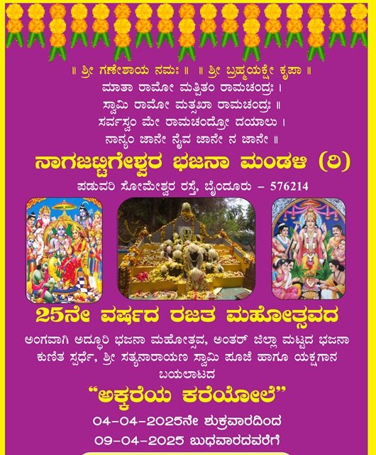 ಬೈಂದೂರು: ಶ್ರೀ ನಾಗಜಟ್ಟಿಗೇಶ್ವರ ಭಜನಾ ಮಂಡಳಿ ಪಡುವರಿ ಸೋಮೇಶ್ವರ ರಸ್ತೆ ಇದರ 25ನೇ ವರ್ಷದ ರಜತ ಮಹೋತ್ಸವದ ಅಂಗವಾಗಿ ಅಂತರ್ ಜಿಲ್ಲಾ ಮಟ್ಟದ ಭಜನಾ ಕುಣಿತ ಸ್ಪರ್ಧೆ,ಸತ್ಯನಾರಾಯಣ ಪೂಜೆ ಹಾಗೂ ಯಕ್ಷಗಾನ ಕಾರ್ಯಕ್ರಮ ಏ.04 ರಿಂದ 09 ರ ವರೆಗೆ ನಡೆಯಲಿದೆ.